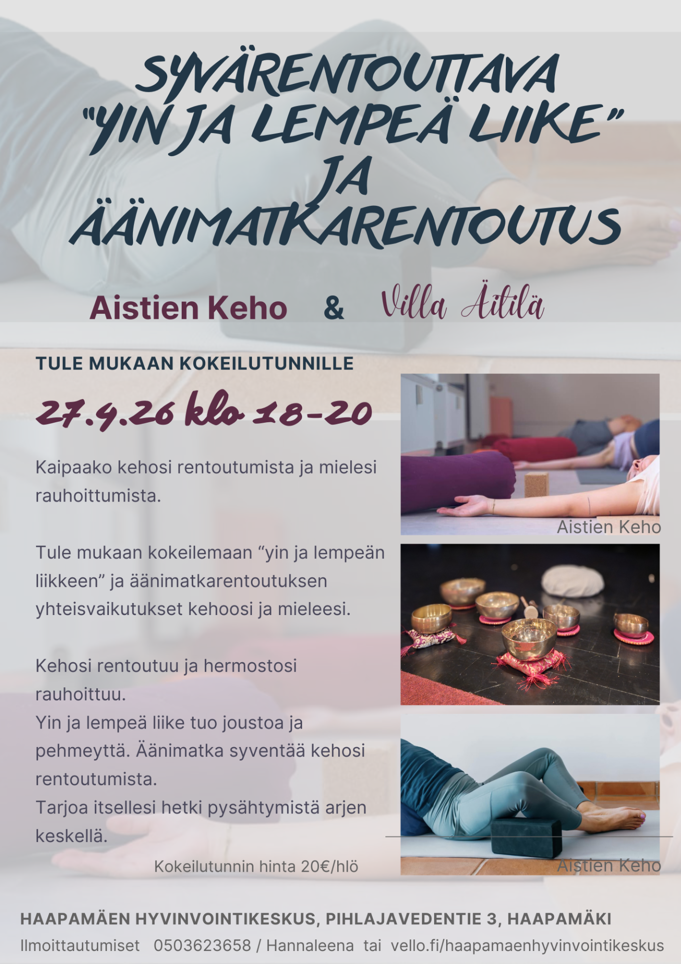 Syvärentouttava "Yin ja lempeä liike" ja äänimatkarentoutus